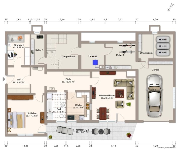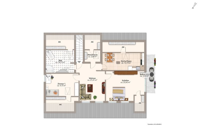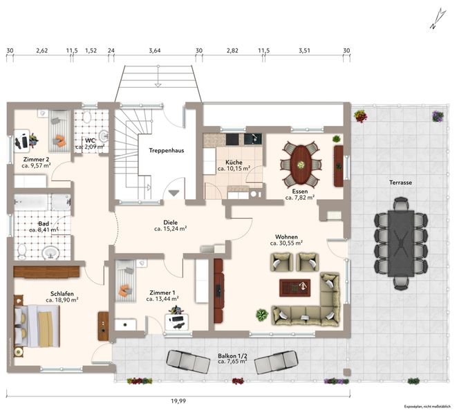 Die Balkone sowie die Terrasse (exkl. Terrassenoption Garagendach) sind hälftig in der Wohnfläche berücksichtigt.