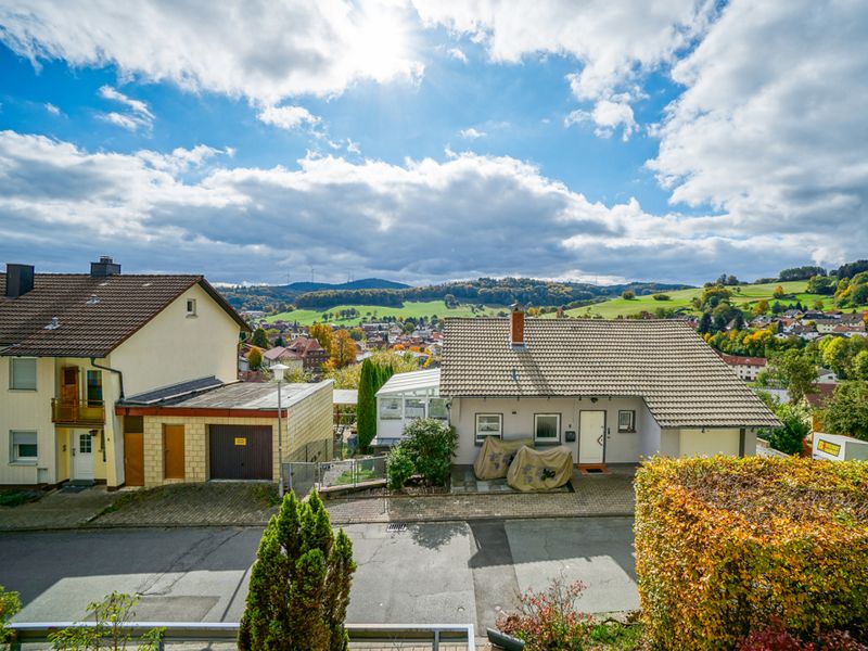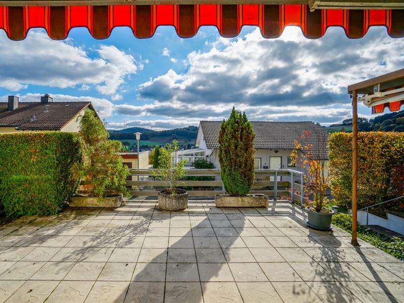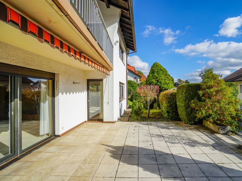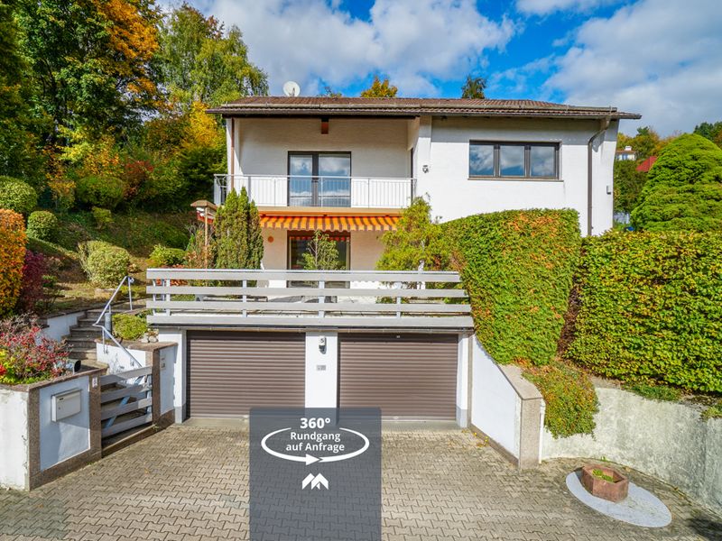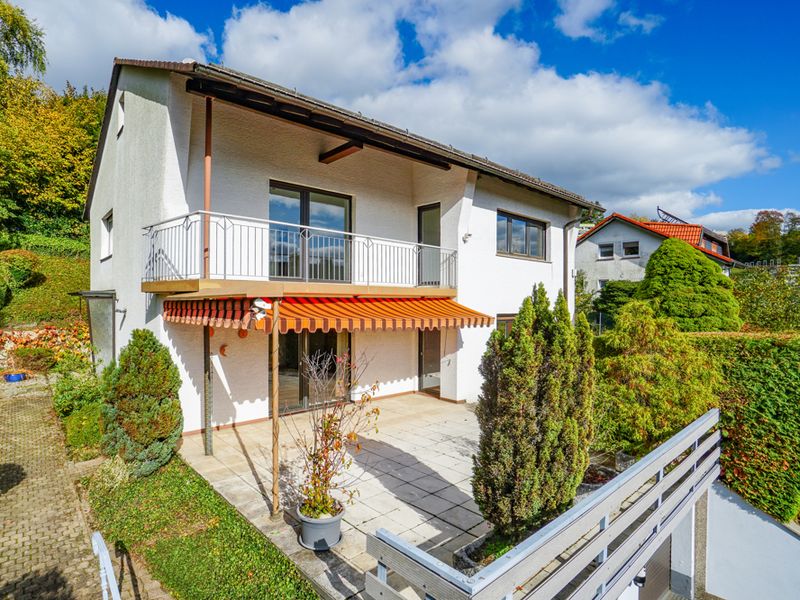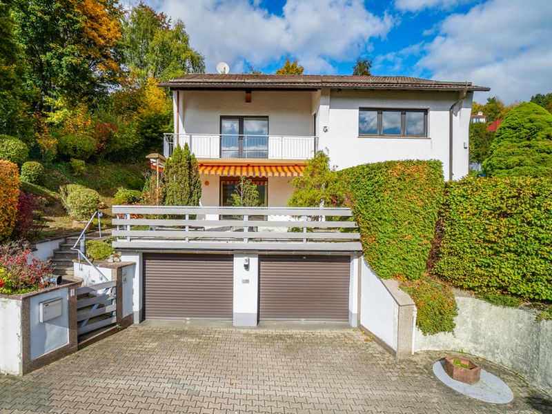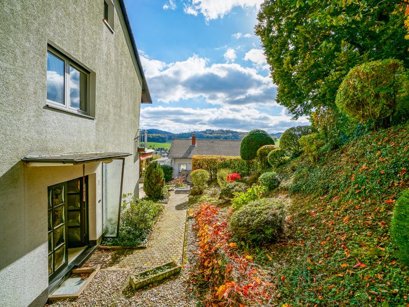 Die Hanglage des Grundstücks wurde durchdacht angelegt: Terrasse und Balkon befinden sich erhöht über dem Straßenniveau und bieten dadurch geschützte, ruhige Rückzugsorte mit schönen Ausblicken. Trotz der Nähe zum Ortskern genießt man hier ein hohes Maß an Privatsphäre und Wohnqualität.