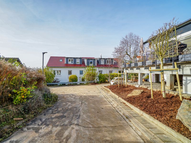 Das Grundstück umfasst ca. 589 m². Der Eingang der Doppelhaushälfte liegt ruhig und geschützt in einer verkehrsberuhigten Stichstraße mit Wendehammer, was ein angenehmes, privates Wohngefühl vermittelt. Die Garageneinfahrt sowie die Terrasse und der Balkon sind zur belebteren Sachsenstraße hin ausgerichtet.