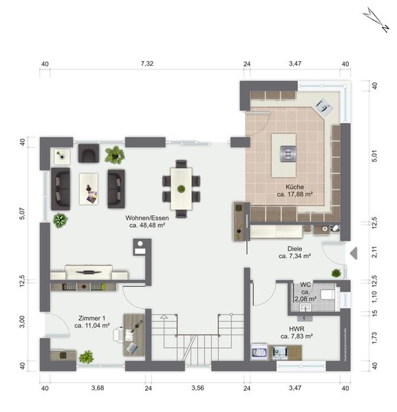 Im Erdgeschoss (ca. 95 m²) dominiert der offen gestaltete Wohn-, Ess- und Küchenbereich, der durch große Fensterflächen viel Tageslicht erhält und sich über eine Galerie bis ins Obergeschoss öffnet. Der stufenlose Übergang auf die sonnige Südterrasse schafft ein besonders großzügiges Raumgefühl. Ergänzt wird das Erdgeschoss durch ein Gästezimmer, ein Gäste-WC sowie einen Hauswirtschaftsraum mit Waschmaschinenanschluss.