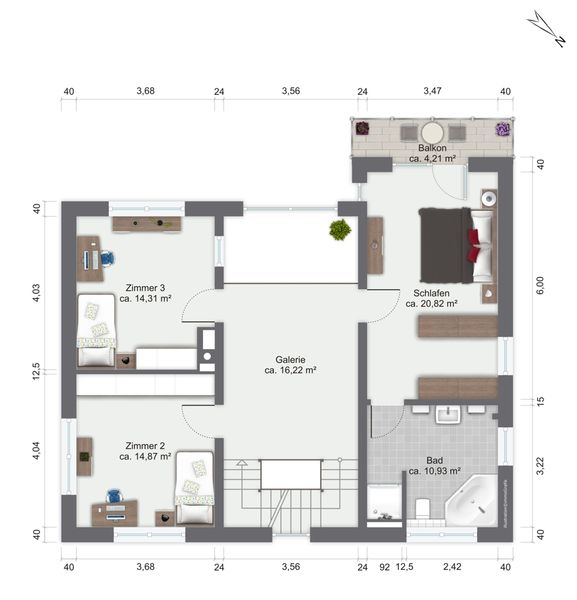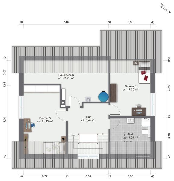 Im Dachgeschoss (ca. 58 m²) finden sich zwei weitere Zimmer, ein modernes Duschbad sowie der Haustechnikraum. Auch diese Ebene ist vollwertig ausgebaut und ideal als zusätzlicher Wohn- oder Arbeitsbereich nutzbar.