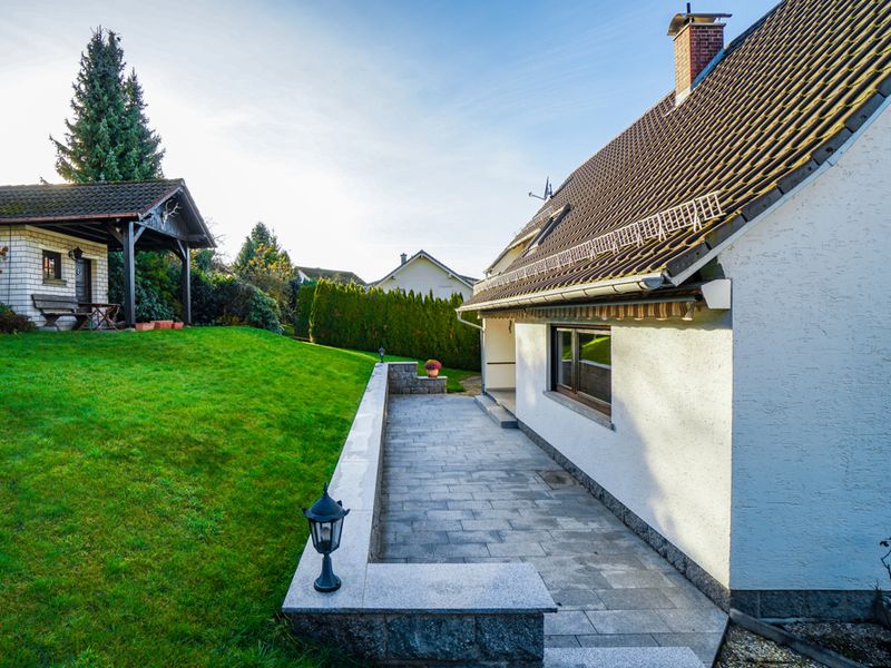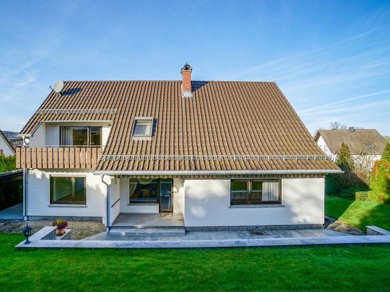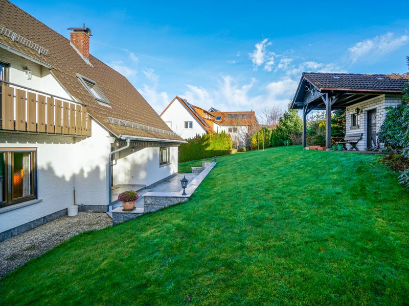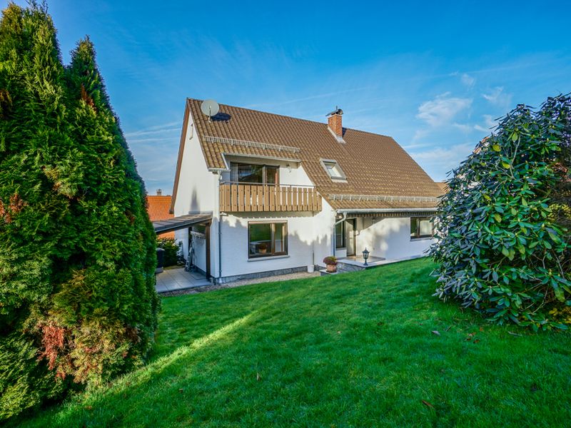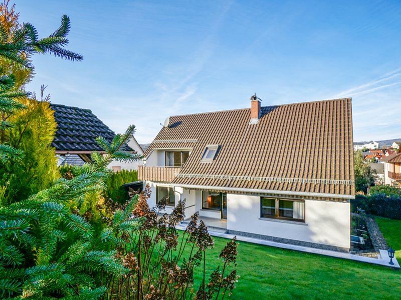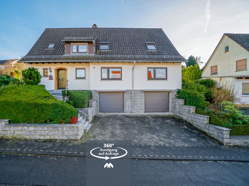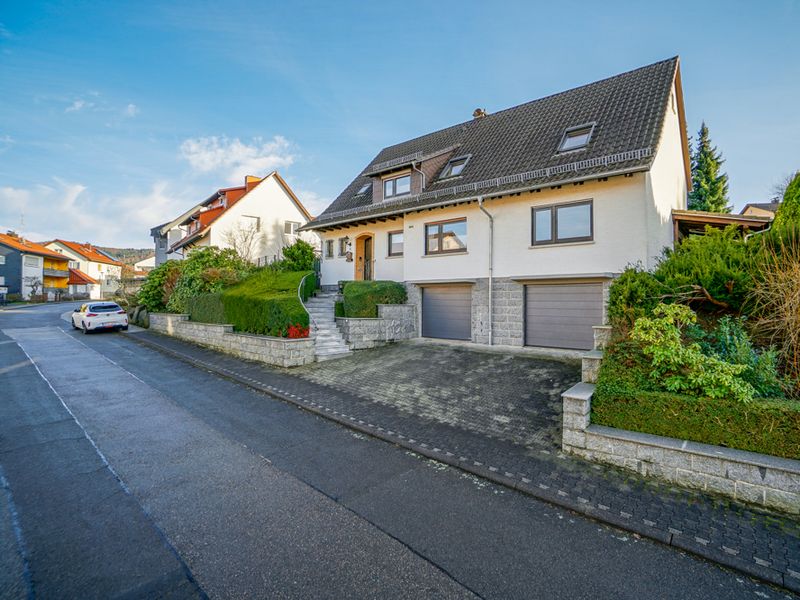 Dieses vollunterkellerte Wohnhaus wurde 1964 errichtet und 1977 um einen westlichen Anbau erweitert. Es präsentiert sich auf einem großzügigen Grundstück von 863 m² in einem sehr gepflegten Gesamtzustand. Die Gebäudestruktur würde eine Zweifamilienhausnutzung ermöglichen. Straßenseitig befindet sich ein schöner, gepflasterter Hofbereich mit Zufahrt zu zwei Garagen. Über eine geschwungene Außentreppe gelangt man zum Hauseingang im Erdgeschoss.