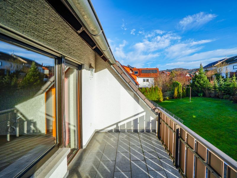 Im Obergeschoss stehen weitere ca. 79 m² Wohnfläche zur Verfügung. Auch hier befinden sich drei Zimmer, ein Abstellraum, ein Bad und eine Küche. Der attraktive Südbalkon – ebenfalls zu einem Drittel in der Wohnfläche enthalten – bietet einen schönen Blick in den Garten und die umliegende Landschaft. Vom Obergeschoss aus kann man auch den nicht ausbaufähigen Dachboden erreichen, der als Speicherplatz sehr wertvoll ist.