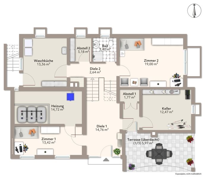Das Objekt setzt sich aus einer Hauptwohneinheit und zusätzlichem Wohnraum im Untergeschoss in Split-Level-Bauweise zusammen. Der vordere Teil des Untergeschosses ist ebenerdig und umfasst zwei Zimmer sowie ein Bad mit insgesamt ca. 64 m² Wohnfläche (inklusive Terrasse, die zu einem Drittel angerechnet ist). Im Untergeschoss befinden sich zudem Kellerräume, die Waschküche mit Außenzugang und der Heizungsraum.