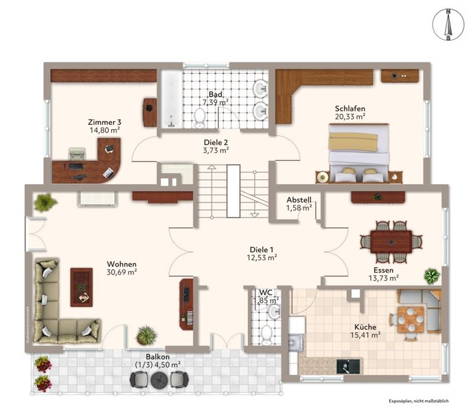 Die Hauptwohnung erstreckt sich über das obere Geschoss ebenfalls in Split-Level-Bauweise und bietet eine Wohnfläche von rund 127 m² (inklusive Balkon, der zu einem Drittel angerechnet ist).