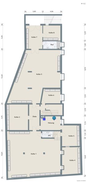 Das Wohn- und Geschäftshaus setzt sich aus vier Geschossen zusammen. Es ist komplett unterkellert. Das Untergeschoss weißt eine Nutzfläche von ca. 340 m² (vgl. Gutachten) auf. Es stehen hier eine Vielzahl von Kellerräumen verschiedenster Größen zur Verfügung.