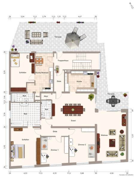Das Dachgeschoss besteht aus zwei Wohnungen mit jeweiligem Maisonettezimmer. Die seit 2019 vermietete Drei-Zimmer-Wohnung mit Westbalkon und ca. 100 m² Wohnfläche (vgl. Mietvertrag) erwirtschaftet eine monatliche Kaltmiete in Höhe von 720,- €. Die angrenzende Vier-Zimmer-Wohnung mit einer Wohnfläche von ca. 90 m² (vgl. Mietvertrag) ist seit dem 01.10.2024 vermietet und erwirtschaftet eine monatliche Kaltmiete in Höhe von 900,- €.